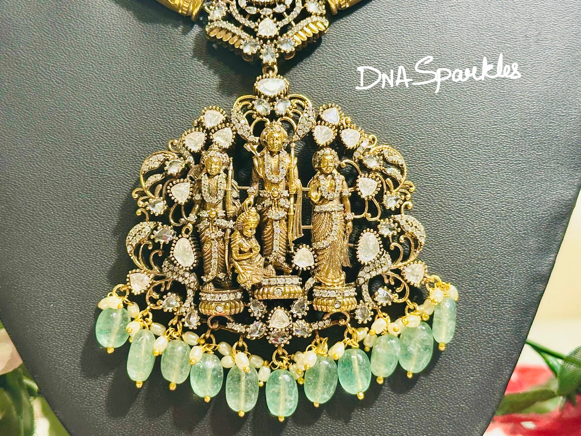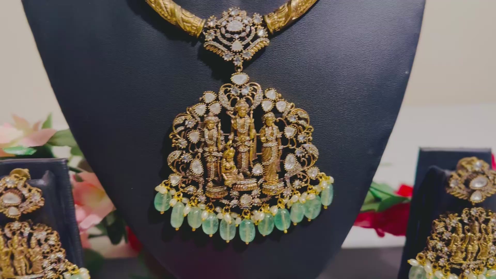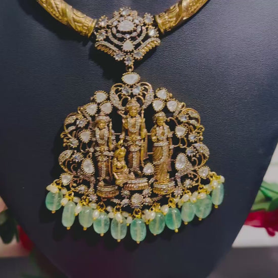 Indulge in the intricate beauty of the Telangana style Kandi Ram Parivar Necklace. Expertly crafted, this necklace showcases a traditional design beloved by the Ram Parivar community. With its unique style and cultural significance, this necklace is sure to make a statement and spark conversation wherever you go.
