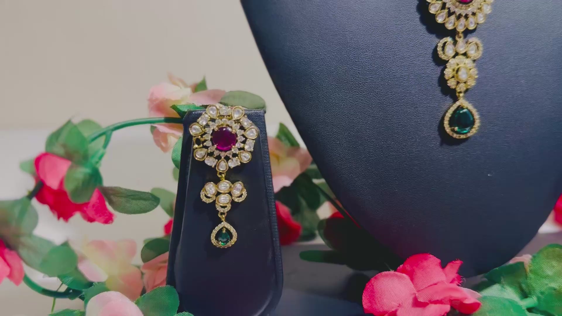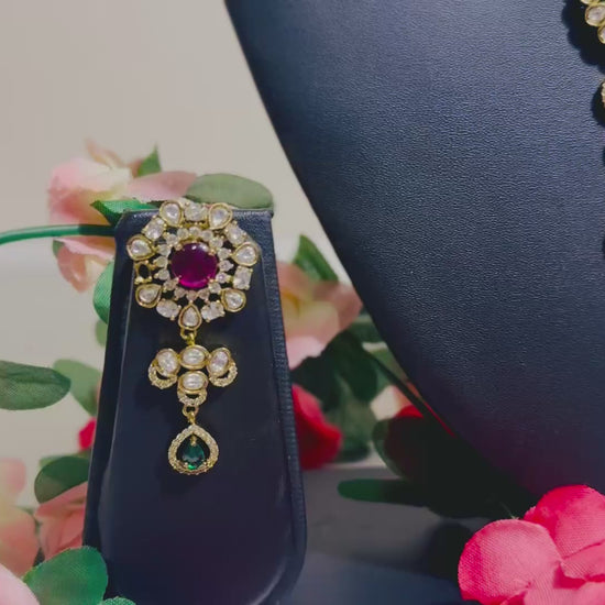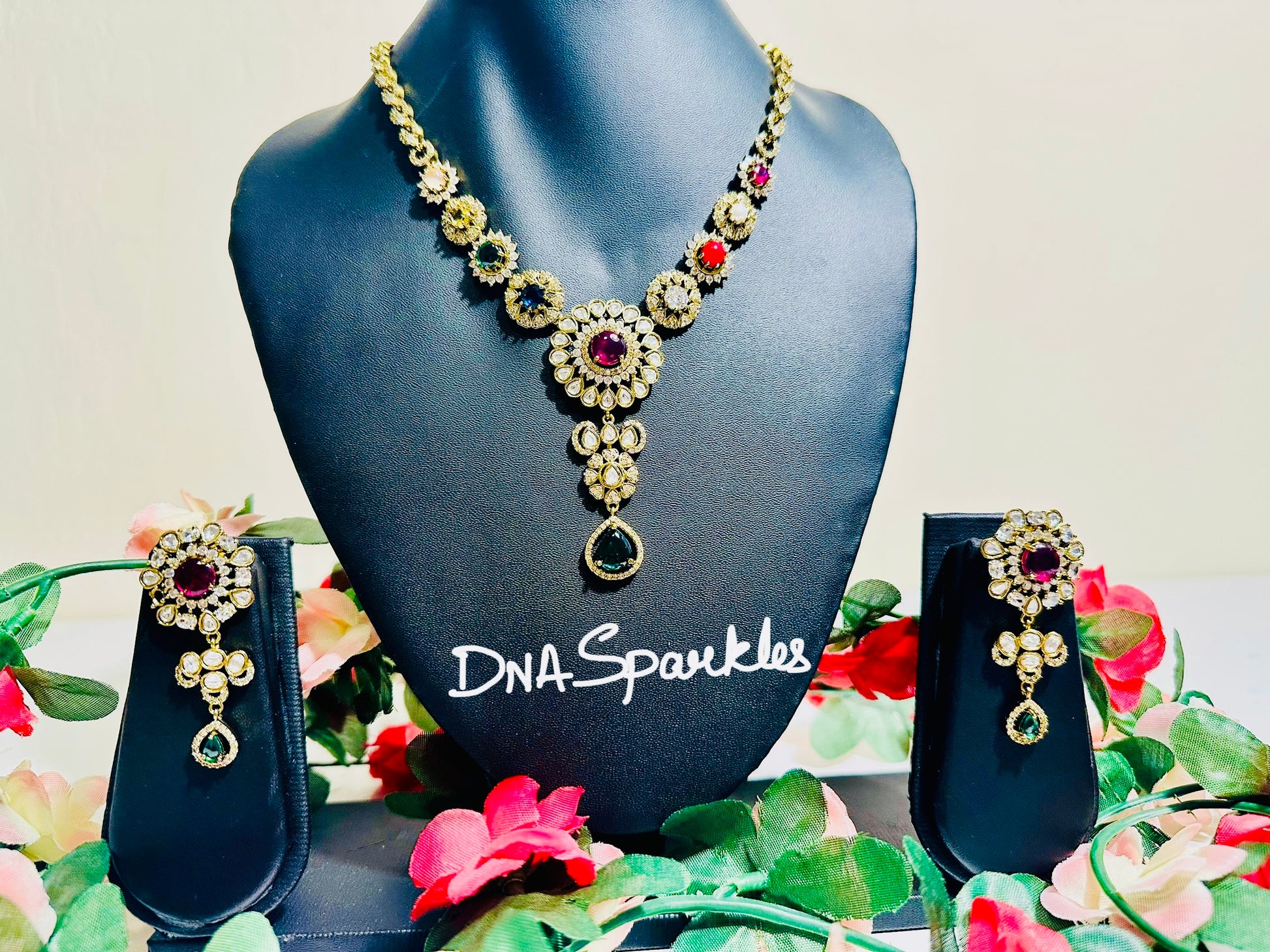 This Navarathna stone necklace features multi-colored stones and comes with a matching pair of earrings. Made of high-quality materials, this necklace adds a touch of elegance and tradition to any outfit. With its vibrant colors and intricate design, it is sure to be a stunning piece of jewelry that will make a statement.