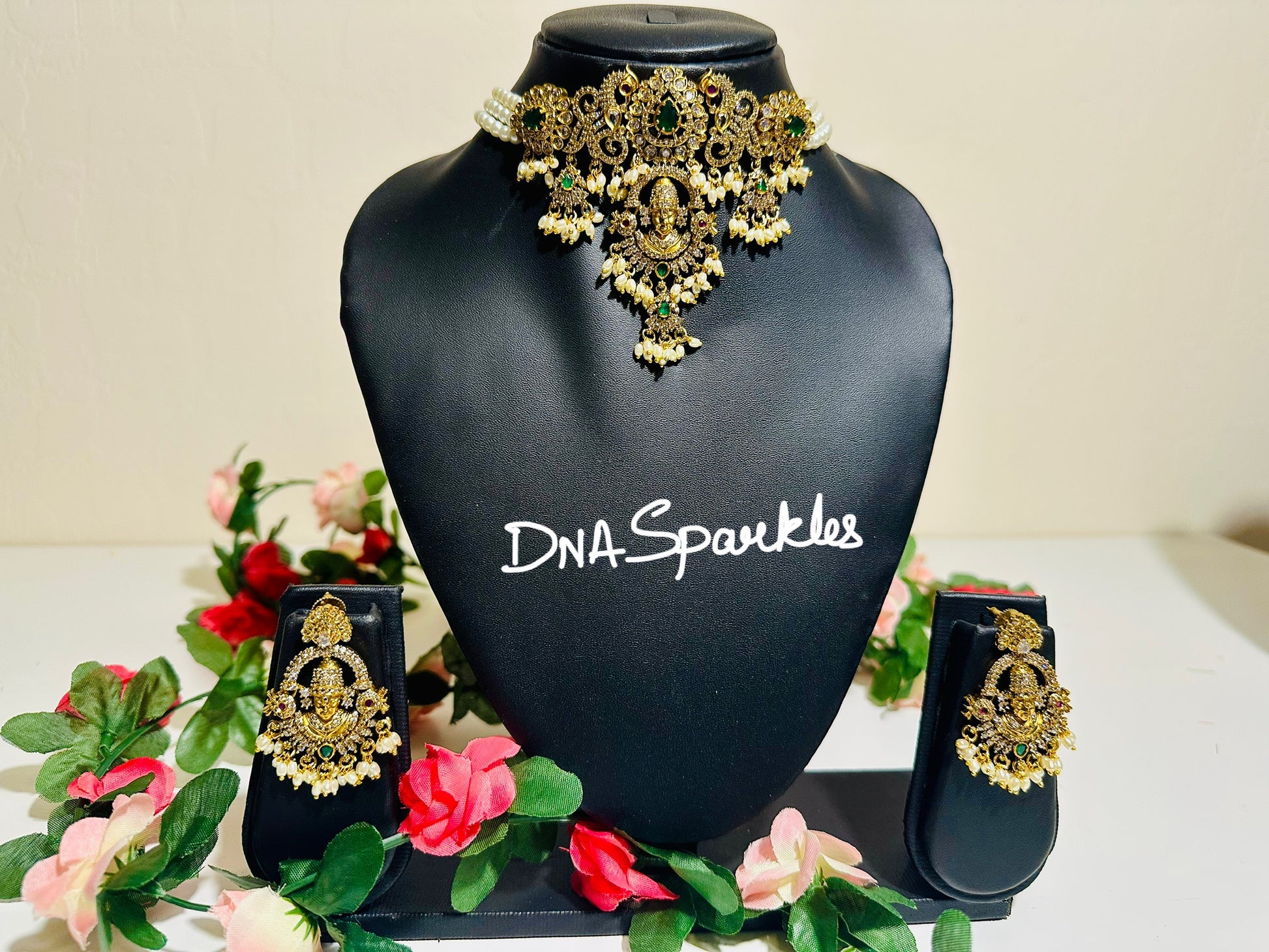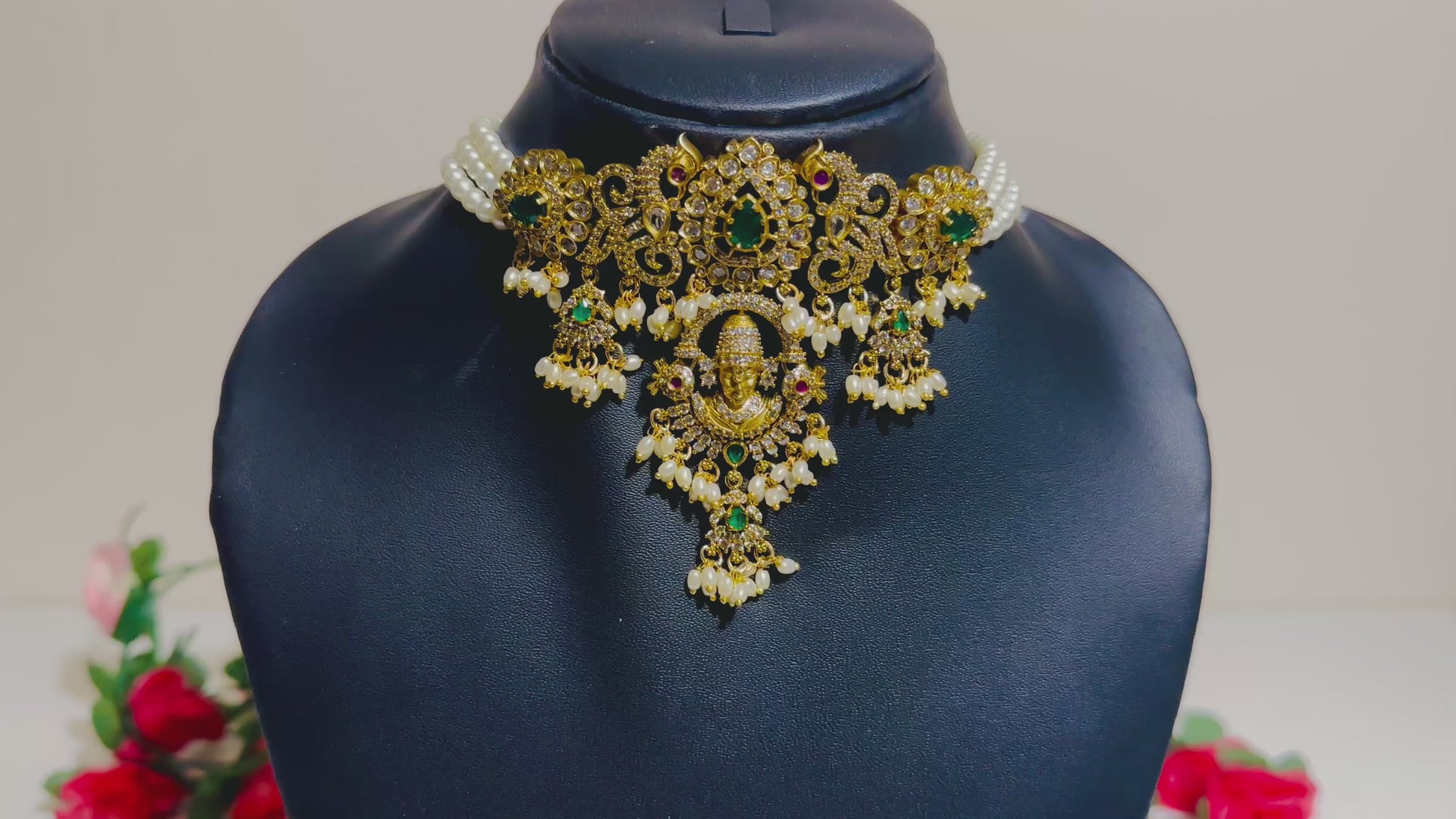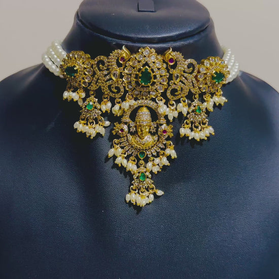 Elevate your traditional attire with the Vishnu Pearl Choker. Handcrafted with careful attention to detail, this choker features the revered face of Vishnu, adding a touch of cultural richness to your look. Made with lustrous pearls, this choker is the perfect fusion of tradition and elegance.
